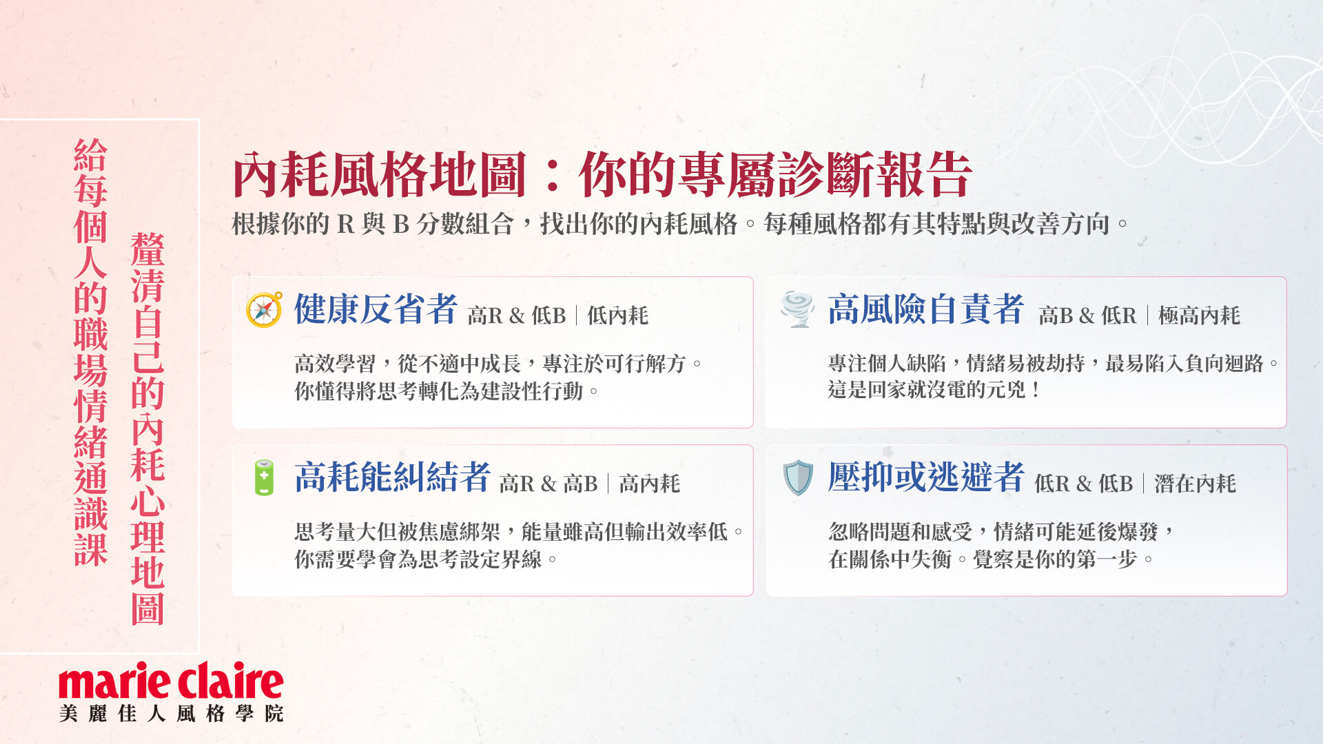 諮商心理師吳姵瑩將透過特別設計的反芻反應風格量表,幫助你快速了解自己的內耗慣性指數、辨識思考慣性,並找出讓你消耗能量的思考模式。你將能初步了解自己是「深思反省」還是「苦惱自責」的類型,幫助你了解能量流失的根源。