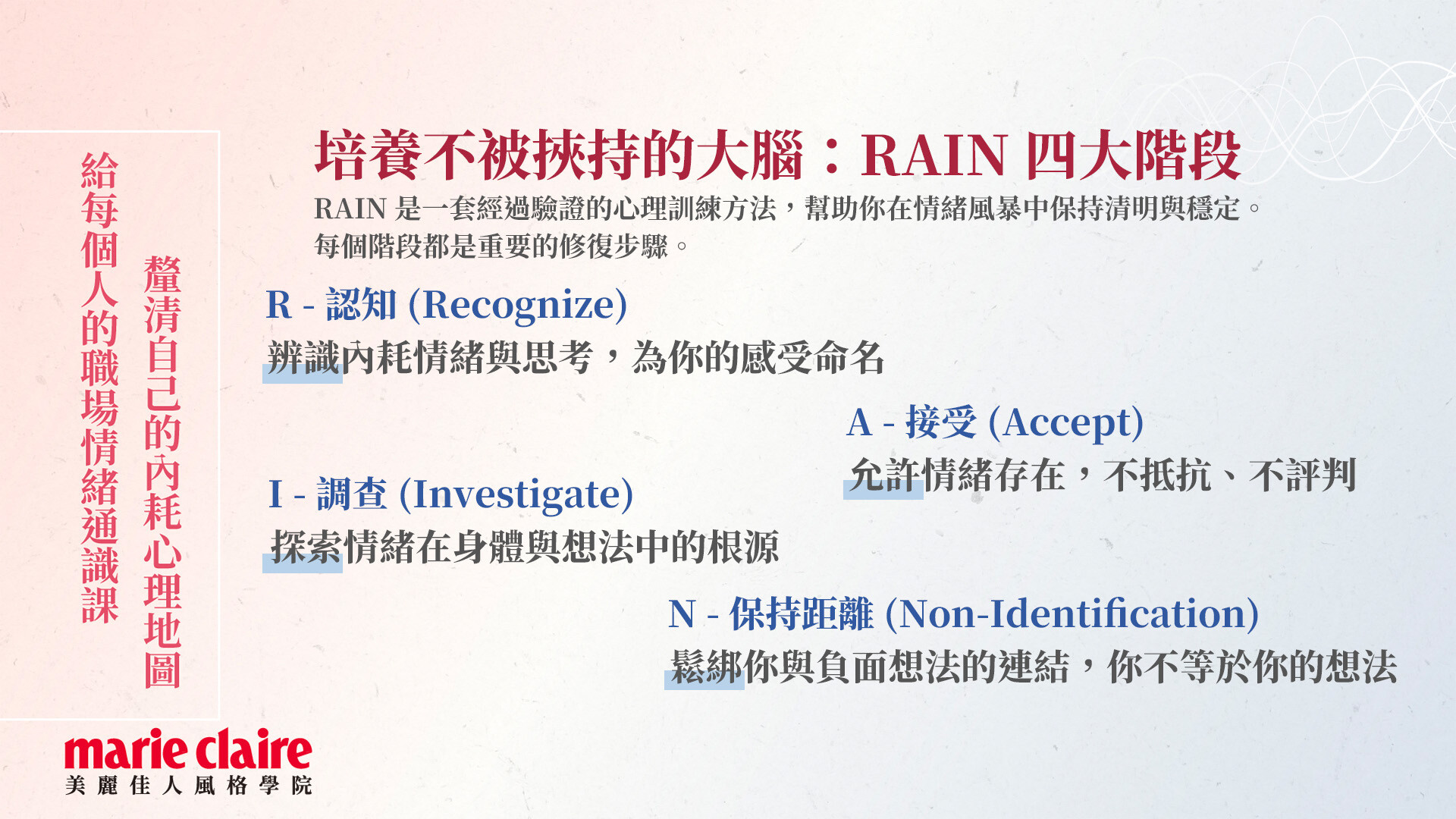 - R-認知(Recognize):辨識內耗情緒與思考,為你的感受命名。
