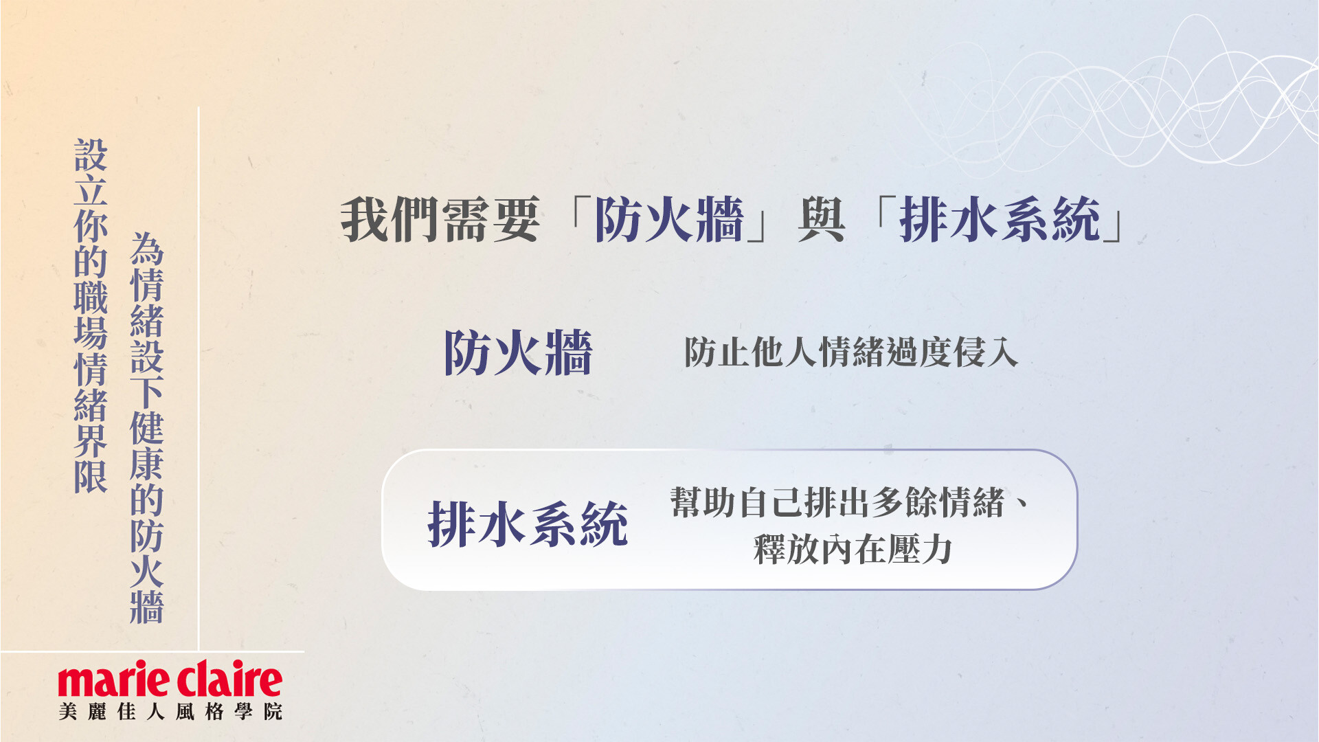 「防火牆」的功能是防止他人的情緒過度侵入;「排水系統」則是幫助我們排出多餘的情緒,進而釋放內在壓力。