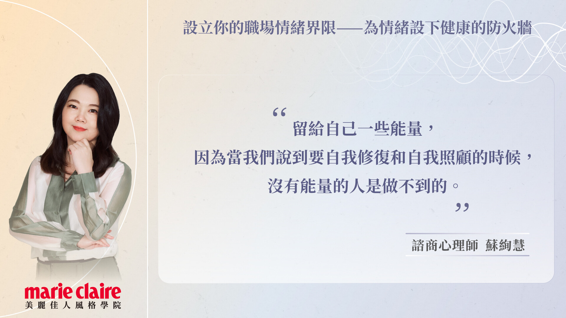 在此堂課程中,諮商心理師蘇絢慧特別以「設下健康的情緒防火牆」為主題,帶領你覺察自我情緒,了解情緒其實也有「身心成本」這個重要的概念,進而學習開始設立自我的「情緒防火牆」。